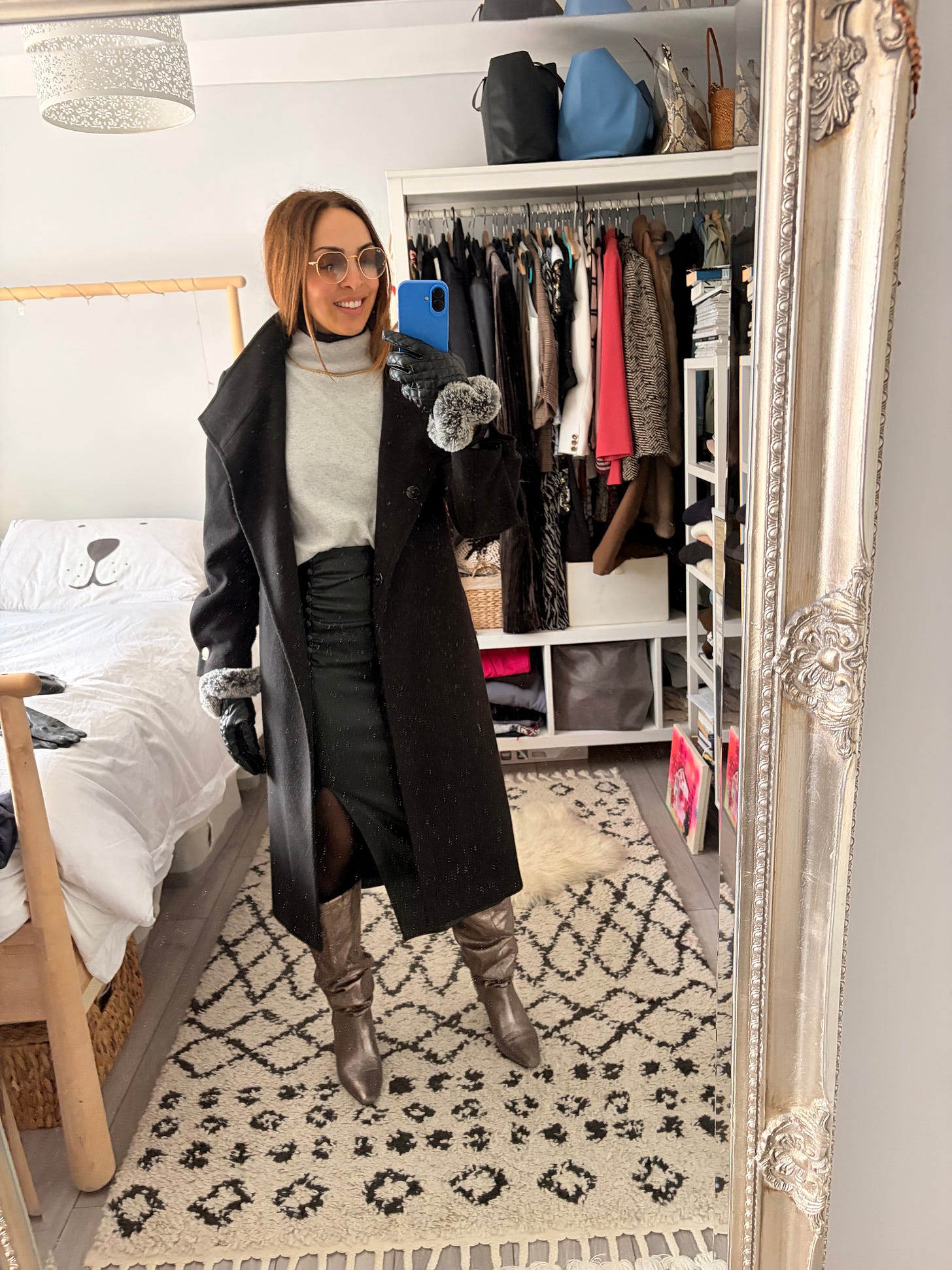 I went to Pinterest, searched “leather skirt outfit,” picked an idea I knew I could recreate with what I already own, and styled it in my own way. Same bones, my personality. I even saved the reference image alongside the outfit in my LookBook.