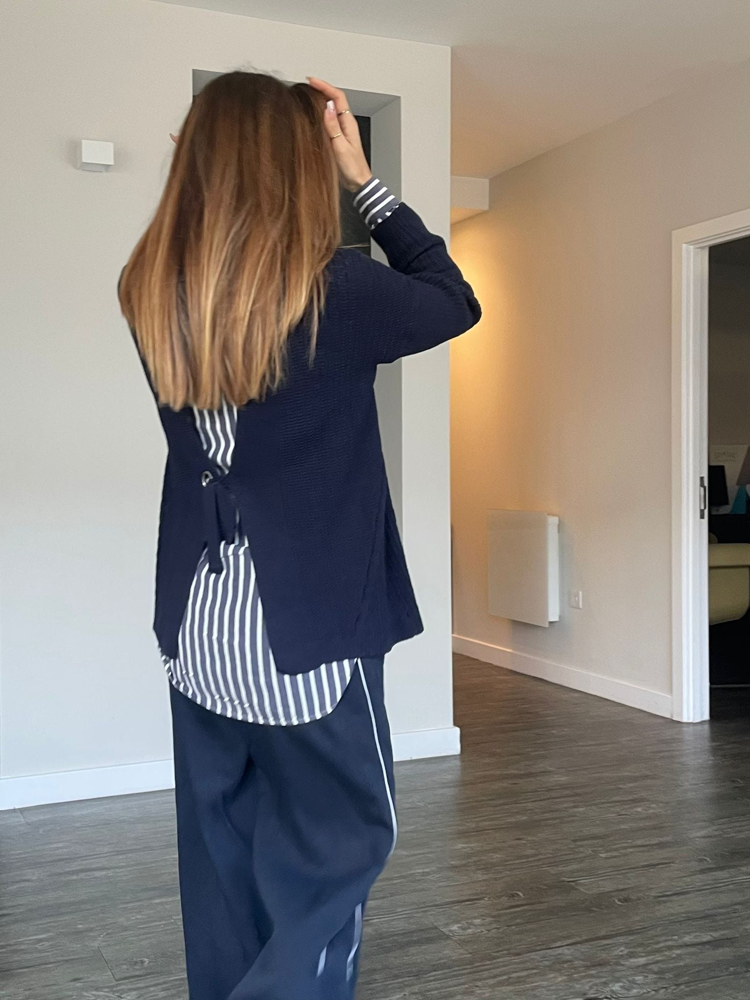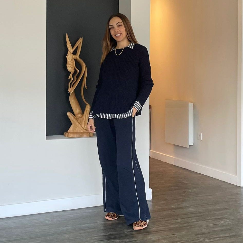 The navy jumper with the open back is a piece I hadn’t worn in years, and I mean years. At least six. I don’t know why it suddenly clicked again, but it feels perfect for this weather and perfectly aligned with my growing love for navy. It’s starting to feel like a softer, richer alternative to black for me when it comes to elegance.